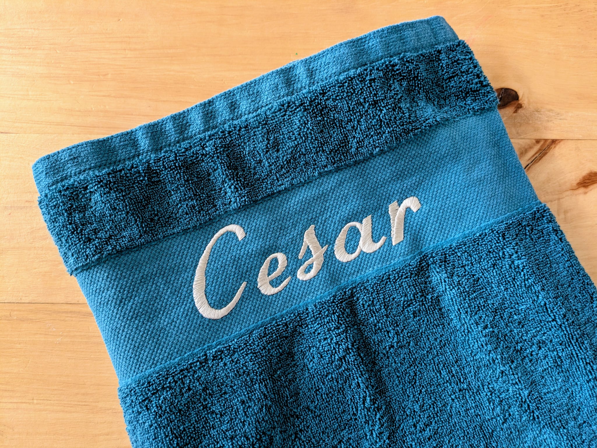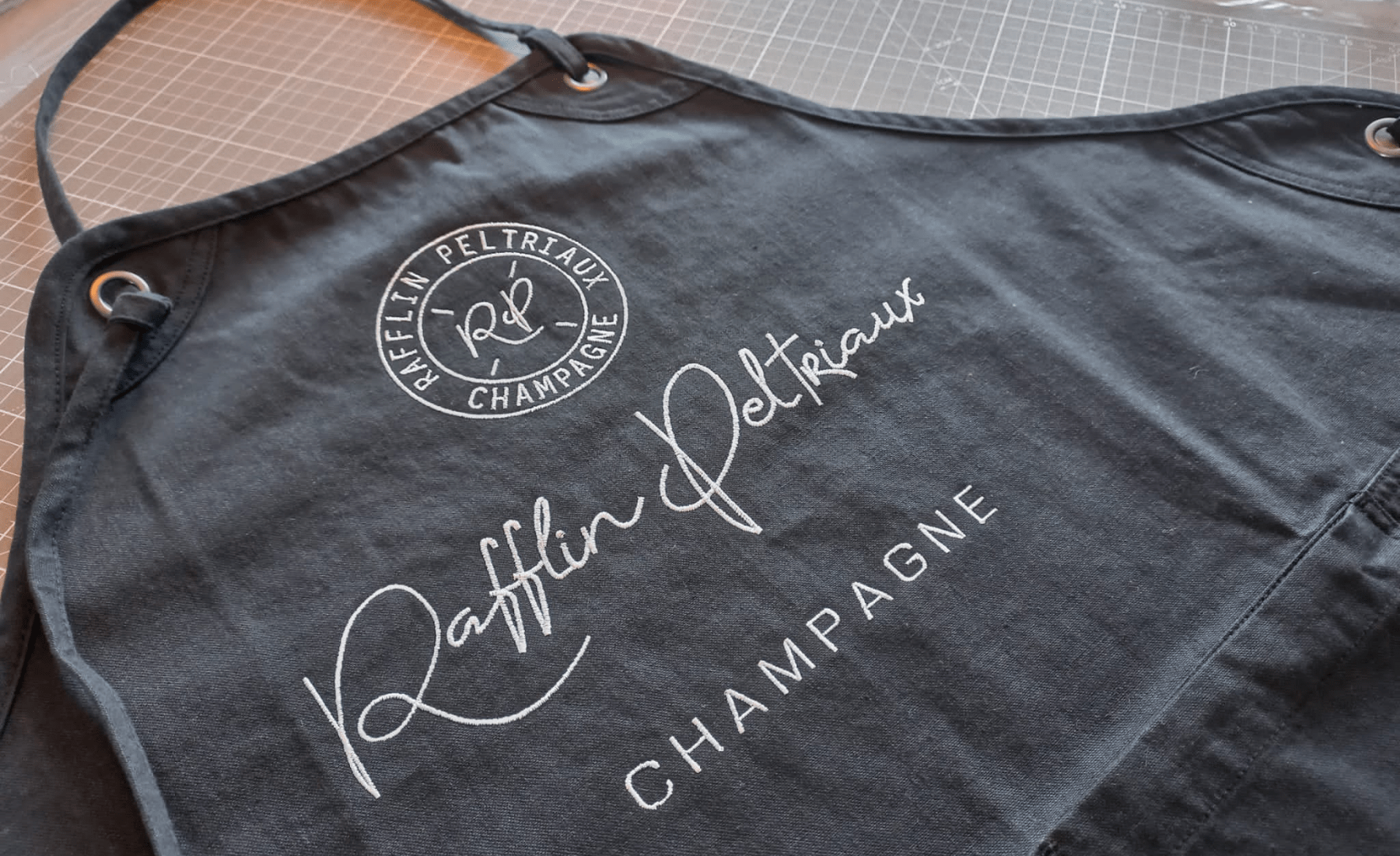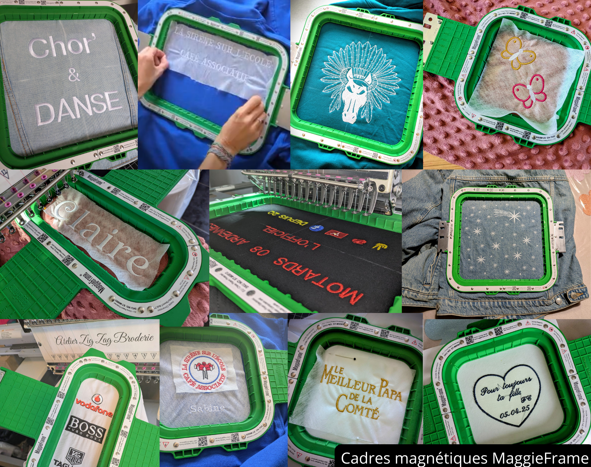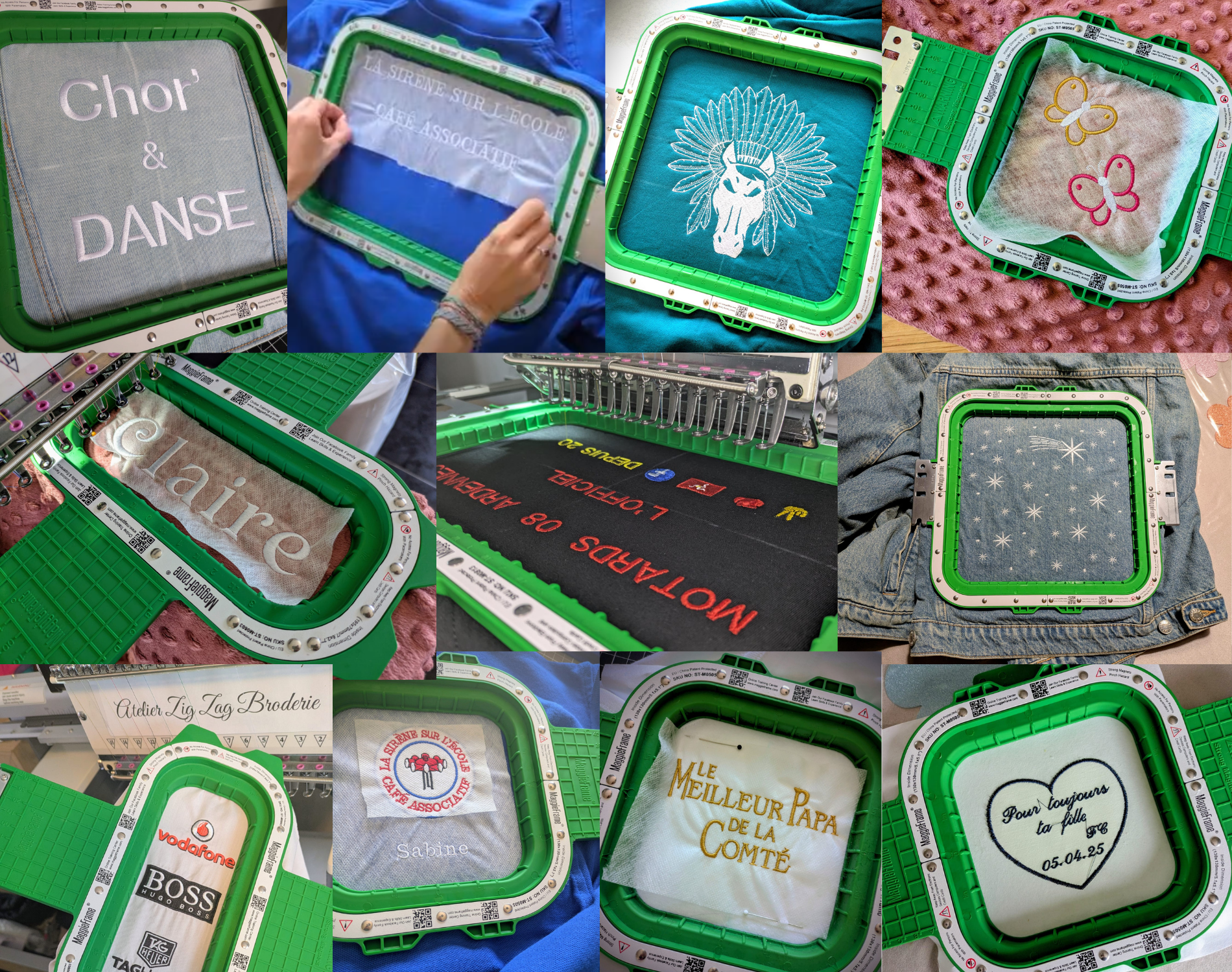 Je travaille avec des brodeuses industrielles et des cadres magnétiques (formats cœur, dos, manchette…), un pantographe adapté aux grandes pièces à broder, un logiciel de broderie professionnel, ainsi que des matières premières de qualité : fils, stabilisateurs et colles des marques Gunold et Madeira.